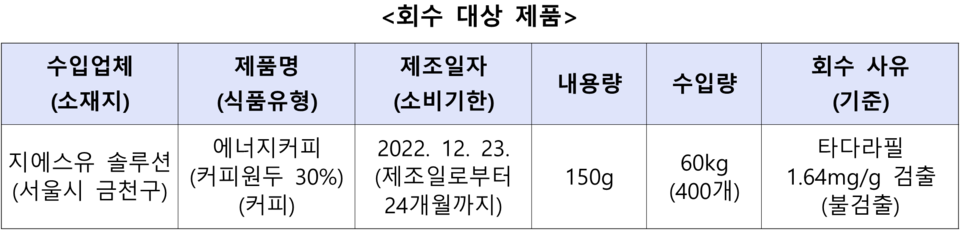 식약처 수입유통안전과 관계자는 "회수 대상은 '지에스유 솔루션(서울시 금천구 소재)'이 수입‧판매한 '에너지커피(커피원두 30%)(식품유형 : 커피, 제조일자 : 2022년 12월 23일)' 제품"이라며 "해당 제품을 신속히 회수하도록 조치했고, 구매 소비자에게 섭취 중단과 구입처에 반품할 것을 당부했다"고 말했다.