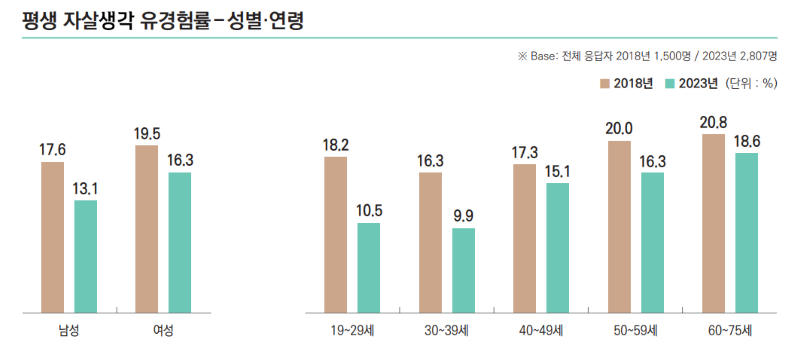 조사 결과에 따르면, 평생 한 번이라도 자살생각을 해 본 적이 있는 사람(이하 자살생각 유경험자)은 14.7%로 2018년(18.5%)에 비해 3.8%p 감소했으며, 여성이 16.3%로 남성(13.1%)에 비해 높고 연령대가 높을수록 증가하는 경향을 보였다.
