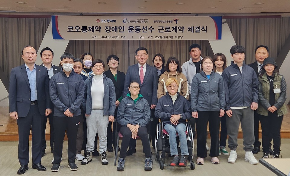 코오롱제약(대표 전재광)은 코오롱타워에서 6명의 장애인 운동선수 근로계약 체결식을 개최했다고 28일 밝혔다.