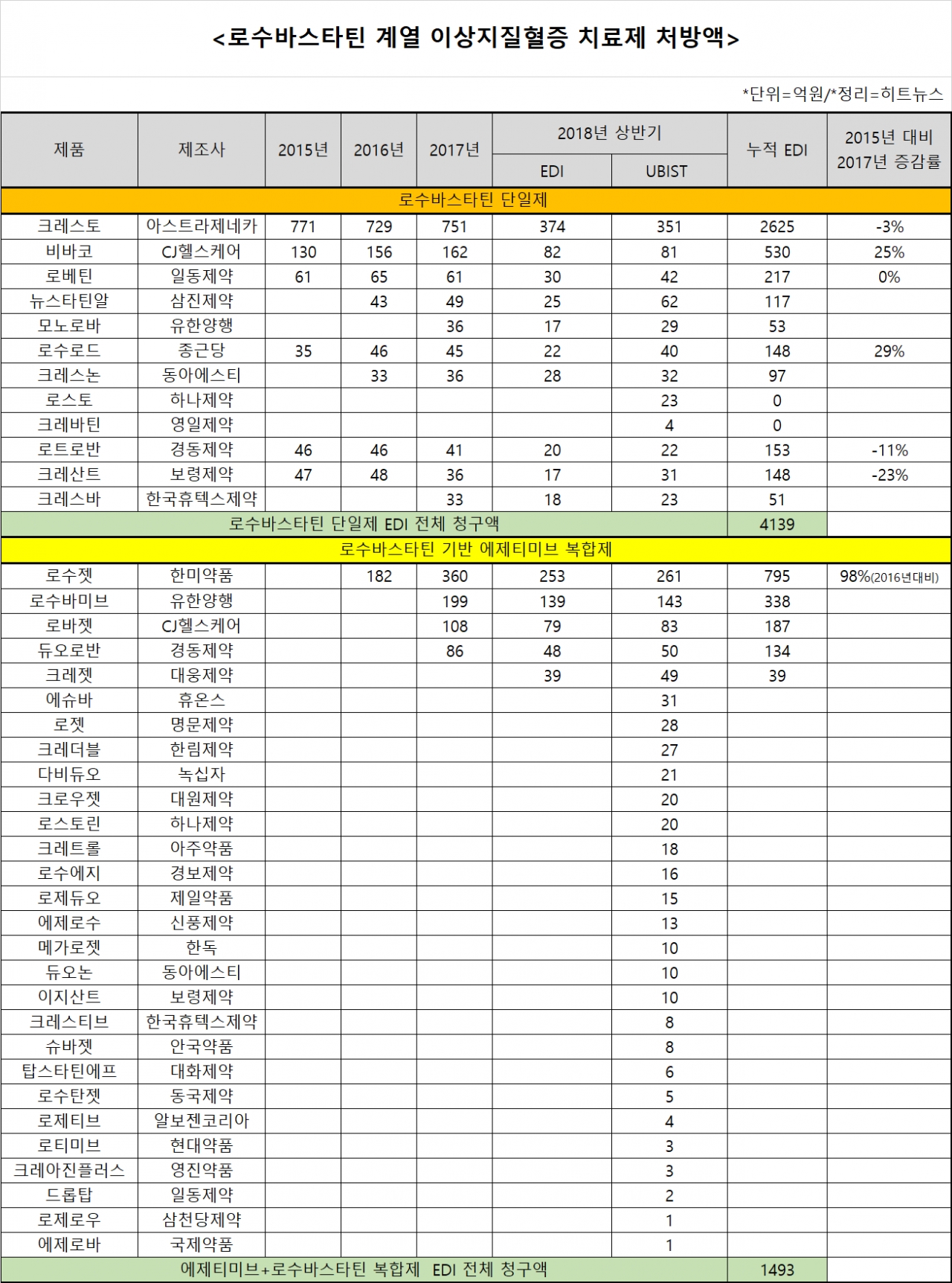 1일 히트뉴스가 2015년부터 2018년까지 보험청구액(EDI) 1000대 품목과 2018년 상반기 원외처방 보고서(UBIST)를 토대로 비교 분석한 결과, 로수바스타틴 단일제 시장에서는 아스트라제네카의 크레스토가 누적 보험청구액(EDI) 2625억원으로 가장 높은 처방 실적을 보였다.