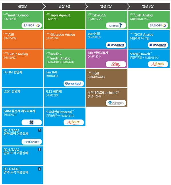 NASH 치료제 'HM15211'은 미국 임상 1상이 진행 중이고, 선천성 고인슐린증 치료제 'LAPSGlucagon Analog(HM15136)'은 국내 1상에 돌입해 식약처에 개발단계 희귀약으로 지정되기도 했다.
