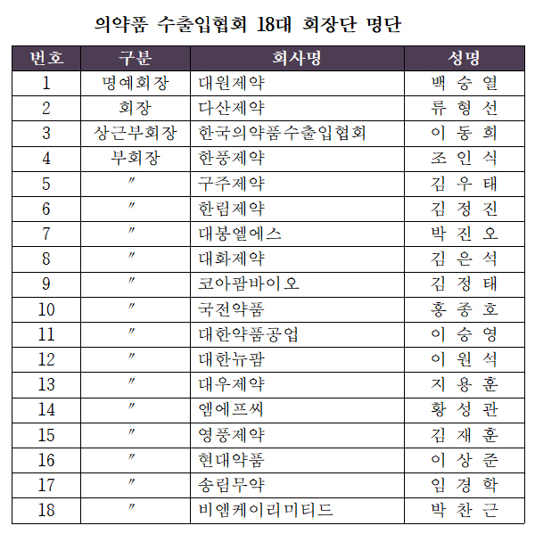 김정태 코아팜바이오 대표를 비롯해 △홍종호 국전약품 대표 △이승영 대한약품공업 대표 △이원석 대한뉴팜 대표 △지용훈 대우제약 대표 △황성관 엠에프씨 대표 △김재훈 영풍제약 대표 △이상준 현대약품 대표가 부회장에 합류했다.