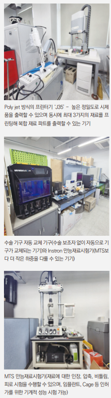 또 기계실에는 '폴리 젯(Poly jet)' 방식의 프린터기(J35), 수술 기구 자동 교체 기구, Instron 만능재료시험기, MTS 만능재료시험기 등 기기가 있습니다. 이곳에서는 '스마트 소프트 구조물' 개발이 목표인데요. 정확히 말하면 소프트한 구조물의 강성을 선택적으로 조절할 수 있는 기술을 연구하고 있는 것입니다. 이러한 기술이 적용된 소프트 구조물을 '스마트 소프트 구조물'이라고 말합니다. 현재는 한국 연구재단의 과제인 '근육 펌핑 현상을 모사하는 내부 유로 압력 제어를 활용한 소프트 구조물 강성 변화 특성 연구'를 수행하고 있습니다.
