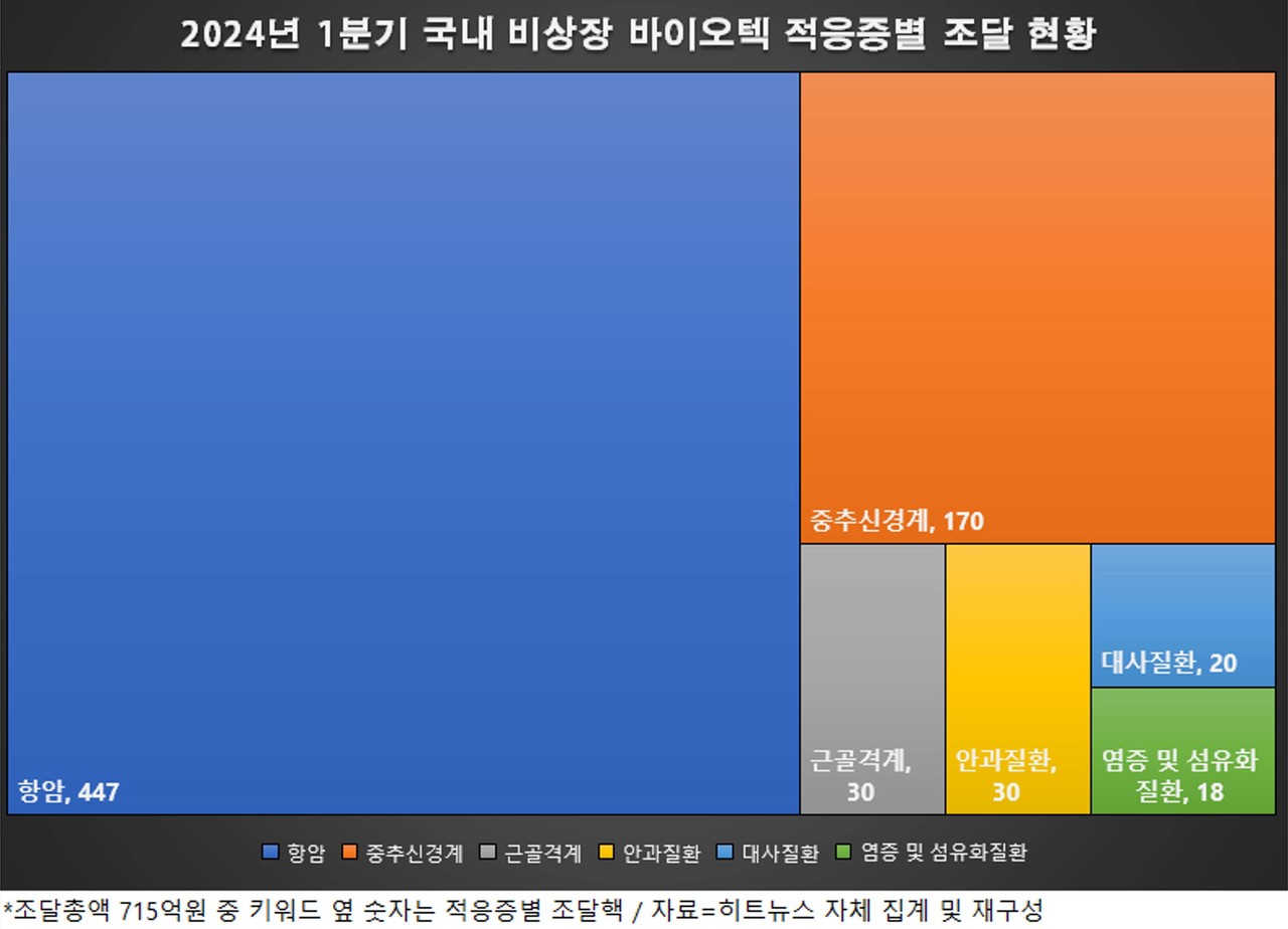 그나마 2023년 1분기와 달리 적응증 톱픽을 중심으로 조달 시장이 형성된 것은 위안거리다. 항암 적응증을 앞세운 기업이 전체 조달액의 60% 이상을 가져갔고 조달 시장 전통의 강자인 중추신경계(Central nervous systemㆍCNS) 치료제 개발 기업의 성과가 뒤를 이었다.