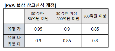 ◆ 분석대상기간 청구금액에 기준하여 협상참고가격 차등화(안 제9조제1항) = 작년 협의체를 통해 논의됐던 바와 같이 협상참고가격 산식이 개정된다. '유형 가'에서 분석대상 청구액이 30억원 이상 50억원 미만일 경우 산식 계수는 0.95, 50억원 이상 300억원 미만일 경우 계수는 0.90, 300억원 이상일 경우 0.85로 차등화 된다. '유형 나'와 '유형 다'에서는 동일한 구간에 적용되는 계수가 각각 0.90, 0.85, 0.80으로, 표로 도식화 하면 아래와 같다.