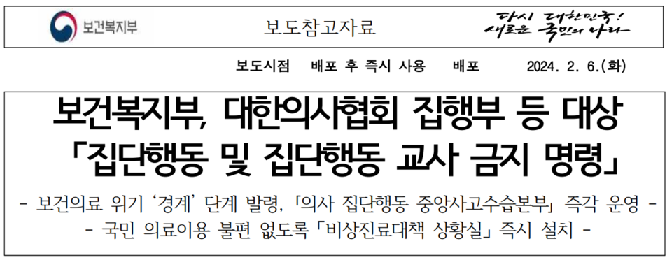 정부는 브리핑을 통해 '의대 정원을 2000명 증원하겠다'고 밝혔다. 대한의사협회(의협)의 반발이 시작되자 정부는 '의사 집단행동 중앙사고수습본부(중수본)'를 설치해 대응했다. 보건복지부는 의사들의 파업을 막기 위해 '집단행동 및 집단행동 교사 금지 명령'을 내렸다.