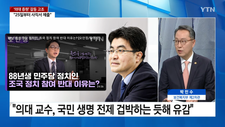 박민수 보건복지부 차관은 YTN 뉴스와이드에 출연해 "의대 증원 없이 수가 인상만으로 문제를 해결하려면 건강보험료가 3~4배 이상 올라갈 것"이라며 "비급여 분야와 미용성형 시장이 급격히 성장하는 문제가 있어, 이 부분과 균형을 맞추려면 의대 정원 증원이 불가피하다"라고 정부 방침을 설명했다.