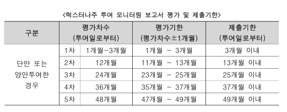 17일 건강보험심사평가원의 럭스터나 성과평가 운영계획에 따르면 럭스터나 투여를 위한 장기추적조사 이행 동의서에 서명한 요양기관은 환자 투여 모니터링 보고서를 4년간 제출해야 한다. 구체적으로 투여 후 1개월~3개월, 12개월 이후 매 1년마다 제출하며 제출기한에 맞춰 투약반응 및 효과를 평가해야 한다.