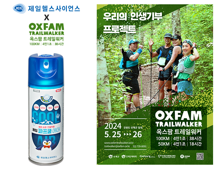 제일헬스사이언스(대표 한상철)는 5월 25~26일 강원도 인제군 일대에서 열리는 전 세계 빈곤층을 돕기 위한 글로벌 기부 프로젝트 '2024 옥스팜 트레일워커'에 분사식 진통소염제 ‘제일파프쿨에어’를 후원한다고 18일 밝혔다.