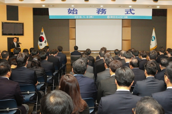 동아쏘시오그룹은 2일 오전, 본사 7층 대강당에서 한종현 동아쏘시오홀딩스 사장, 엄대식 동아에스티 회장, 최호진 동아제약 사장 등 임직원들이 참석한 가운데 2019년도 시무식을 가졌다.