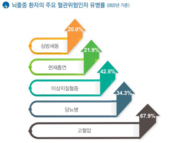 또, "뇌졸중 환자의 주요 혈관위험인자의 유병률은 △고혈압 67.9% △당뇨병 34.3% △이상지질혈증 42.5% △흡연 21.9% △심장세동 20% 등으로 나타났다"며 "일반 인구의 발병률에 비해 높아 평소 위험인자의 적극적인 조절이 필요한 것으로 나타났다"고 덧붙였다.