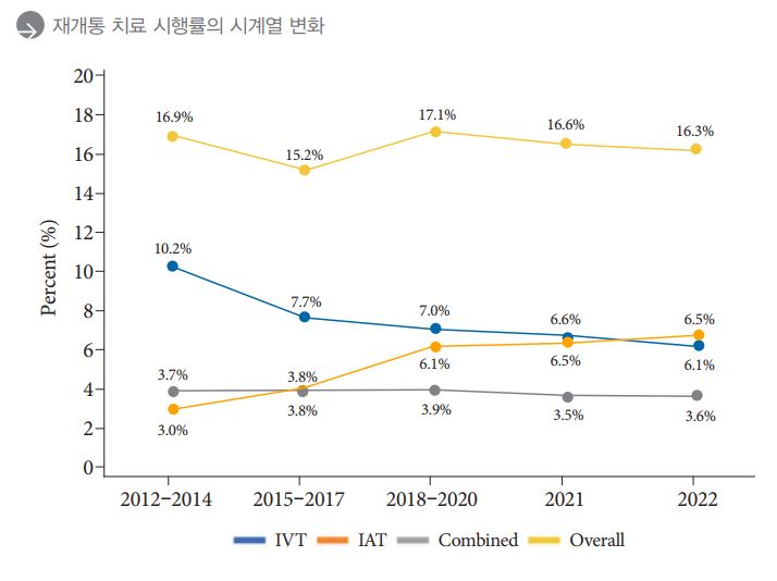 이외에도 골든타임 내 방문과 직결되는 재개통치료(정맥내 혈전용해술, 동맥내 혈전제거술)의 경우 전체 환자 중 16.3% 정도가 시행 받는 것으로 확인됐다. 10년간 동맥내 혈전제거술을 시행 받는 환자는 6.7%(2012~2014년)에서 10.1%(2022년)로 증가했으나, 정맥내 혈전용해술을 시행 받는 환자는 10.2%(2012~2014년)에서 6.1%(2022년)로 감소했다.