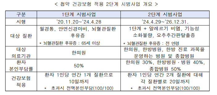 이에 복지부는 대상 질환과 참여기관 확대, 건강보험 적용기준 및 환자 본인부담률 개선, 시범 수가 조정 등 시범사업 개편 계획을 작년 12월 건강보험정책심의위원회에 보고했고, 위원회에서 첩약 건강보험 적용 2단계 시범사업을 올해 4월부터 2026년 12월까지 시행키로 한 바 있다.
