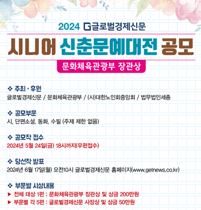 한편 글로벌경제신문사가 주최하는 '2024 글로벌경제 시니어 신춘문예 대전'은 문화체육관광부와 대한노인회중앙회, 법무법인 세종 등이 후원한다.