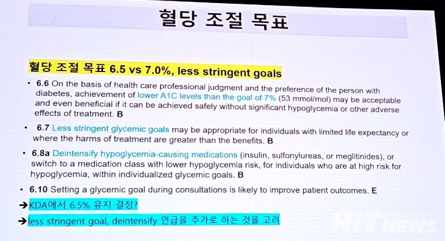 또 "당화혈색소 목표 기준을 ADA는 7%로 설정하고 있고, KDA는 6.5로 정하고 있다"며 "이 부분을 유지할 지 아니면 조정할 지에 대해서도 진료지침을 개정함에 있어서 고려돼야 할 것"이라고 부연했다.