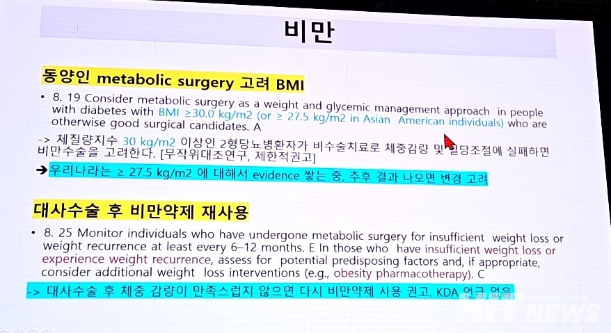 강 교수에 따르면, ADA는 비만대사수술이 필요한 BMI(체질량지수, ㎏/㎡) 기준을 ADA는 30.0로 제시하고 있고, 아시아인은 27.5로 정하고 있다. 이 기준을 넘는 제2형당뇨병 환자가 비수술치료로 체중감량 및 혈당조절에 실패하면 비만수술을 고려할 수 있다는 것이다.