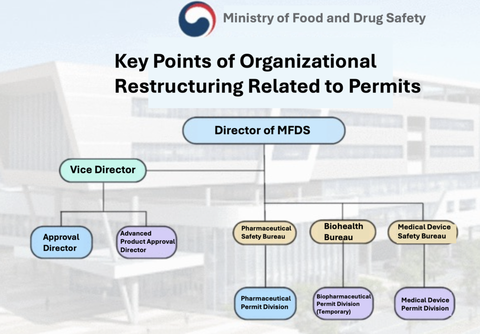 According to the MFDS, effective May 7th, the roles of the Approval Director-General and the Advanced Product Approval Director-General, operating under the existing deputy director-general structure, will be eliminated. Instead, a new framework will be established within the Pharmaceutical Safety Bureau for overall pharmaceutical approvals, the Medical Device Safety Bureau for medical device approvals, and the Biohealth Bureau for bio-pharmaceutical policy, including the temporary establishment of the Bio Approval Team.