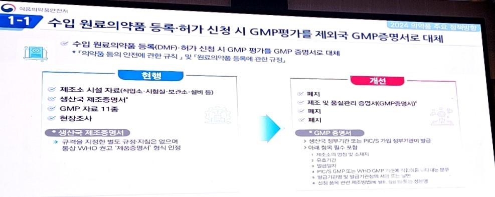 김 과장에 따르면, 현재 수입 원료의약품 등록·허가 신청 시에는 △제조소 시설 자료(작업소·시험실·보관소·설비 등) △생산국 제조증명서 △GMP 11종 자료 △현장조사 등이 필요하나, 향후 유관 법규가 개정된다면 GMP 증명서만으로 대체가 가능해진다.