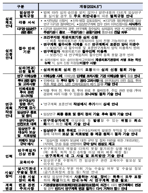또한 기존 이상반응 발생 시 조치 매뉴얼 뿐만 아니라 발생할 수 있는 이상반응 등 위험을 최소화하기 위한 사전 대책(연구대상자 안전보호 대책)을 기술하도록 안내했다.