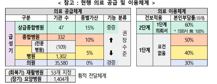 상급종합병원부터 동네의원 간 불명확한 역할 구분은 의료 공급-이용-보상‧평가-수련으로 이어지는 의료체계 전반의 왜곡을 초래한다는 지적을 개선하겠다는 것이다.
