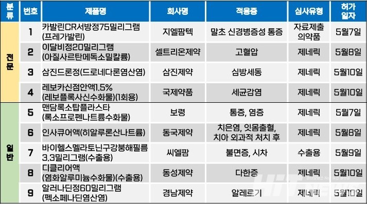 지난주(5월6일~5월10일) 총 9개 품목이 식품의약품안전처로부터 품목허가를 받았다. 전문의약품은 4개 품목, 일반의약품은 5개 품목이다. 이들은 말초 신경벙증성 통증, 고혈압, 심방세동 등 다양한 적응증으로 허가됐다.