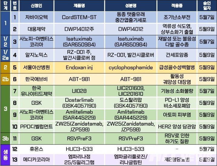 임상시험계획은 총 13건이 승인됐다. 세부적으로 △1상 2건 △1/2상 1건 △1/2a상 1건 △2상 1건 △2b상 1건 △3상 4건 △3b상 1건 △생물학적 동등성 2건 등이다. 이 임상시험들은 조기난소부종, 역류성 식도염, 상부소화기 출혈, 활동성 궤양성 대장염, 아토피 피부염 등 질환과 간세포암종, 비소세포폐암, 담관암 등 암종을 대상으로 승인됐다.