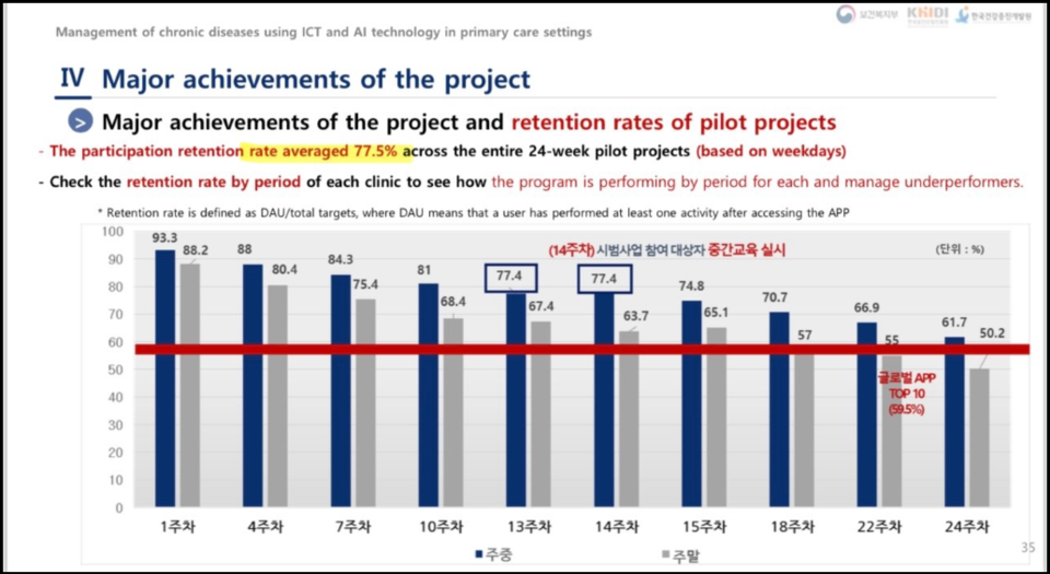 이어 "4~5주쯤에는 앱을 활용하지 않는 환자가 있었다. 그런 환자들은 유지율이 80% 밑으로 떨어졌지만, 의료진이 확인하고 전화나 메시지를 통한 동기부여로 유지율이 다시 상승했다"고 덧붙였다.