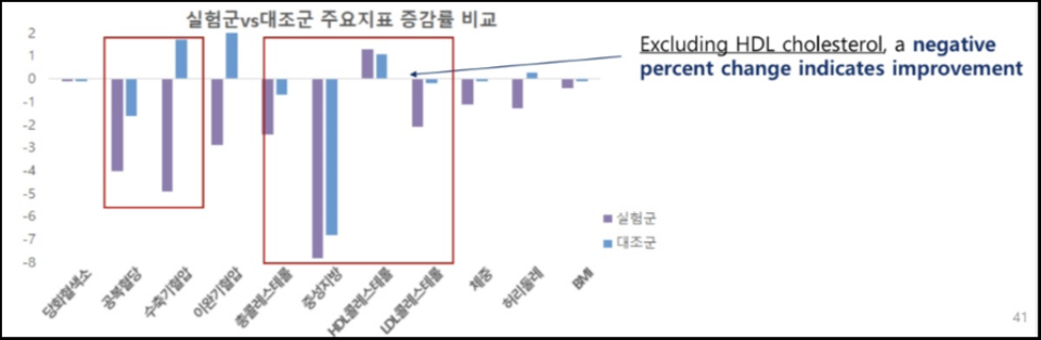 연구결과에 따르면, 시험군의 헤모글로빈과 공급 혈당·혈압이 비교군 대비 빠른 속도록 떨어지는 것으로 나타났다.