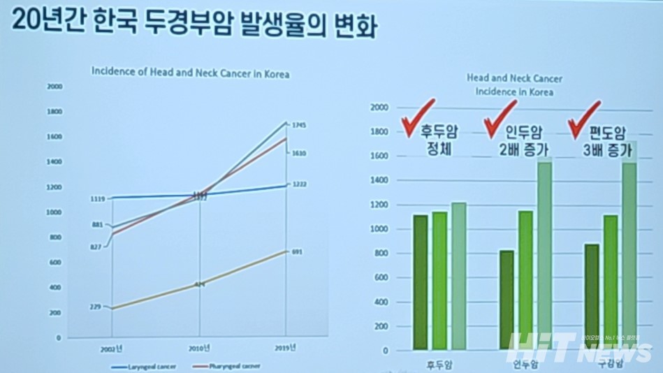 이세영 교수에 따르면, 두경부암은 구인두암, 구강암, 인두암, 후두암, 침샘암, 코암 등을 포괄하는 질환으로 2019년 기준 국내에 5613례가 보고됐다. 남성은 4306례를 차지했는데, 이는 전체 남성 암발생의 7위 수준에 해당하는 수준이다. 또, 최근 20년간 인두암은 약 2배, 구인두암은 약 3배가 늘었던 것으로 나타났다.
