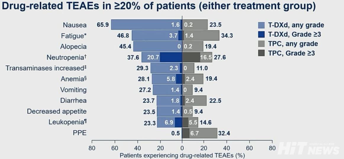 올해 3월 18일 기준, 866명의 환자(HER2 저발현=713명, HER2 초저발현=153명)가 무작위로 배정됐으며, 이 중 90.4%는 이전 CDK4/6 억제제로 치료받은 경험이 있었다. TPC 그룹 환자들은 카페시타빈(59.8%), 나브파클리탁셀(24.4%) 또는 파클리탁셀(15.8%)이 투여됐다.