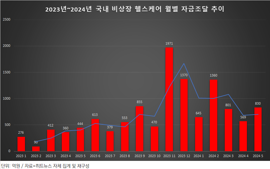 2024년 5월 국내 비상장 헬스케어 기업이 약 830억원의 자금을 확보한 것으로 나타났다. 올해 4월 연내 최저 조달 성과를 기록한 이후의 급반등이다.