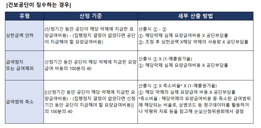 급여정지 또는 급여 제외시에는 조정 등이 없었다면 산정기간 동안 공단이 해당 약제에 지급해야 할 요양급여비용 100분의 40으로 산정한다. 급여범위 축소에서는 [(조정 등이 없었다면 산정기간 동안 공단이 해당 약제에 지급한 요양급여비용) - (산정기간 동안 공단이 지급해야 할 요양급여비용)] 100분의 40으로 산정한다.