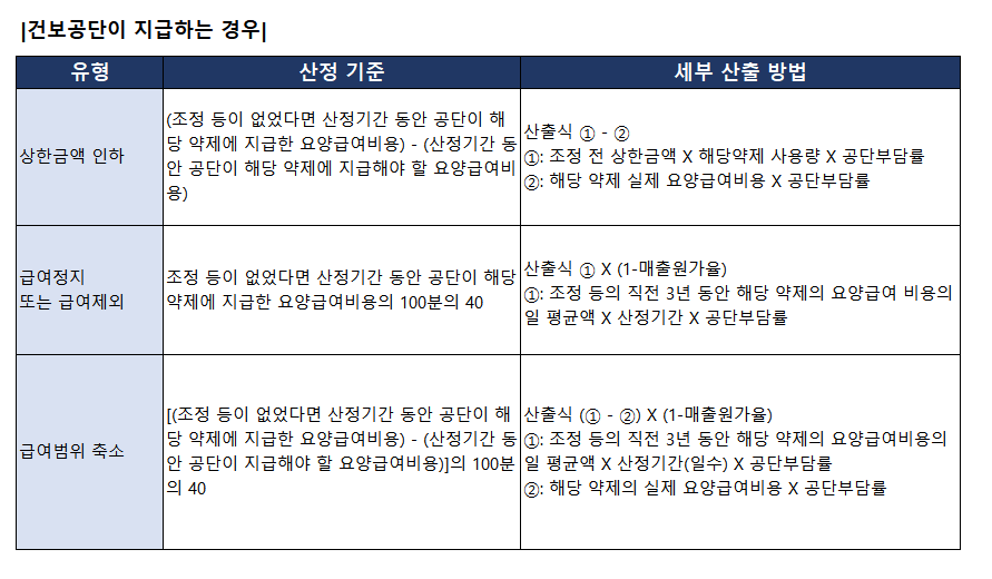공단이 제약사에 지급 경우도 동일하게 3가지 유형으로 나뉜다. 상한금액 인하 시에는 (조정 등이 없었다면 산정기간 동안 공단이 약제에 지급해야 할 요양급여 비용) - (산정기간 동안 공단이 약제에 지급한 요양급여비용)으로 산정한다. 실무에서 보면 '조정 전 상한금액 * 해당 약제 사용량 * 공단 부담률' - '해당약제 실제 요양급여비용 * 공단부담률'이다.