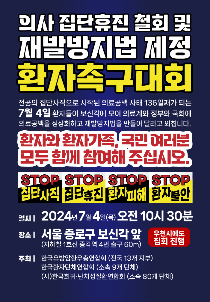 92개 환자단체가 내달 4일 오전 10시 30분, 서울 종로구 보신각 앞에서 의사 집단휴진 철회 및 재발방지법 제정을 촉구하는 대규모 집회를 개최한다.