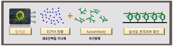 정상인의 경우 비활성 상태로 존재하는 PKA(protein kinase A)가 암 환자의 경우 PKA가 활성이 되면서 세포 외부로 방출이 되는데 이를 세포 외부의 PKA, 즉 ECPKA(extracellular PKA)라고 한다. 혈액으로 방출된 ECPKA를 면역세포는 이를 외부 공격으로 인식해 자가항체(autoantibody)를 생성하는데 이 자가항체의 양을 측정하는 게 튜머스트린의 윈리다. 튜머스크린은 혈액 속의 ECPKA 자가항체를 정량함으로써 암의 유무를 판별 할 수 있다.
