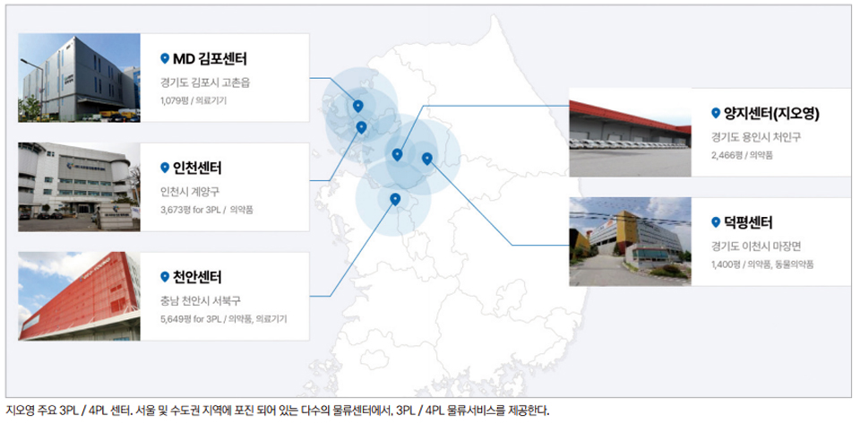 ① 의약품 유통 및 3PL/4PL 사업 = 지오영은 55개 배송센터 기반의 전국 네트워크를 보유한 국내 1위 의약품 유통사다. 전국 2만4000여 약국 중 80% 이상, 전국 3차 상급종합병원(47개)의 약 40%와 거래하고 있다.