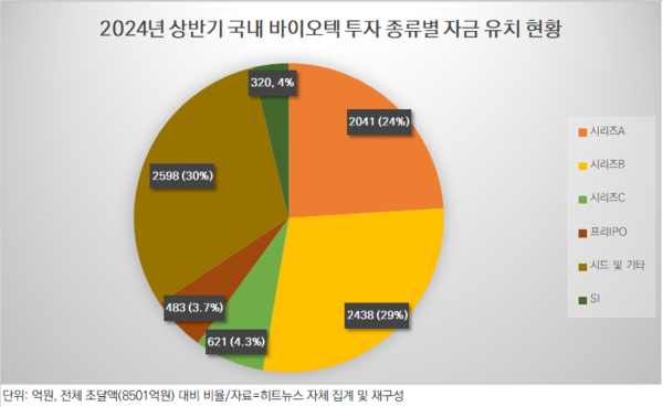 2024년 상반기 조달 실적을 투자 '라운드별'로 보면 시리즈 B의 비중이 가장 컸다. 그간 국내 비상장 바이오텍 반기 조달 라운드에서 줄곧 시리즈 A에 가장 많은 기업과 자금이 몰렸던 것과 대조된다. 이 기간 시리즈 B 라운드를 통해 조달한 금액은 2438억원이다. 같은 기간 시리즈 A(2041억원) 성과를 근소하게 앞섰다.