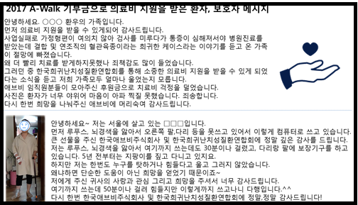 “단순히 걸음 포인트만 보면 실제로 기부활동을 체감하기가 어려웠을 것 같아요. 그런데 이전에 기부된 내용, 그로 인해 조금이나마 삶의 기쁨을 누리는 내용 등을 보니 울림이 있더라고요. 전 별거 안 한 것 같은데, 고마워 하는 내용의 글들을 보고는 더 자극을 받았죠.”