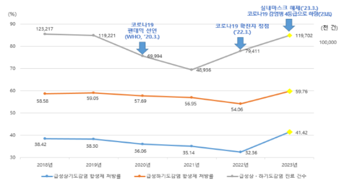 급성 상기도감염 항생제 처방률은 2022년 32.36%에서 2023년 41.42%로 증가했다. 2002년부터 감소세를 보였으나 코로나19 유행 이후 항생제 처방이 증가하면서 증가한 것으로 나타났다.