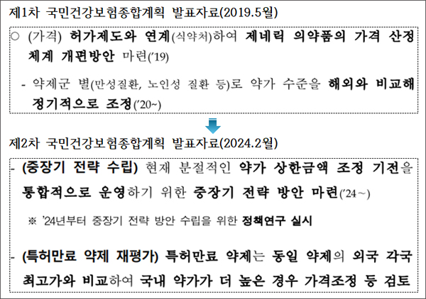 해외약가 재평가 제도의 도입은 이미 2019년 5월 "제1차 국민건강보험종합계획" 수립 당시 예고된 바 있었다. 최초에 수립된 연차별 시행계획과 비교하여 제도의 대략적인 윤곽이 나오기까지 상당한 시간이 소요되었으며, 그만큼 제도를 원활하게 추진하기 위해 다양한 준비와 검토 과정이 있었음을 짐작할 수 있다. 그렇게 5년여 만에 2024년 2월 "제2차 국민건강보험종합계획"에서 비교적 명확한 '하나의 방안'으로 제시되었는데, 이후 참조국가와 참조방법 등 세부 적용방안을 마련하는 과정에서는 여러 선택지가 거론되며 각 조합마다 복잡성과 불확실성이 커졌고, 그 결과 약효군마다 가격 인하될 약제(제약사)들 간의 형평성 문제로도 이어지게 되었다.