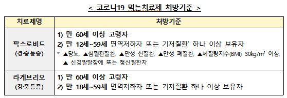 의료계에는 코로나19 치료제가 꼭 필요한 고위험군 환자에게 활용될 수 있도록 처방기준 준수를 당부드린다고 덧붙였다. 특히, 코로나19 치명률은 60세 이상에서 증가하므로 고령자를 집중 보호할 수 있도록 60세 미만 환자의 경우 환자별 위험도를 고려해 처방하기를 권고했다.