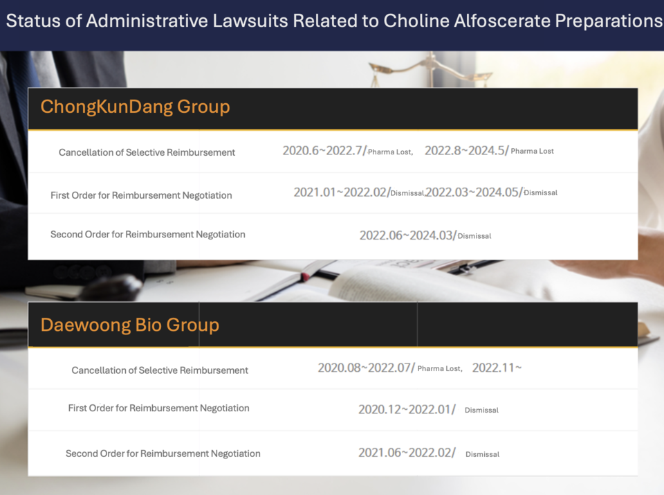 Legal battles concerning choline preparations have so far revolved around two primary areas: lawsuits seeking to overturn the selective reimbursement notice and those contesting the reimbursement negotiation orders. The government has prevailed in all related cases thus far. In August 2020, the Ministry of Health and Welfare (MOHW) implemented selective reimbursement for indications outside of dementia, prompting pharmaceutical companies to challenge the decision in court. Represented by the law firms Bae, Kim & Lee and Shin & Kim, these companies have faced continuous setbacks. The case is currently in its third appeal, although the selective reimbursement notice remains suspended.