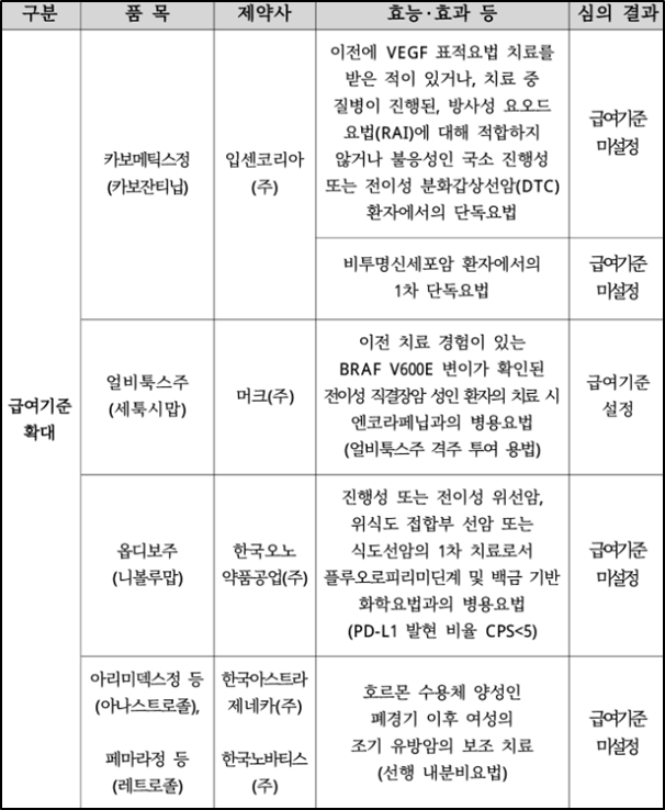 △옵디보(성분 니볼루맙) △카보메틱스(성분 카보잔티닙) △아리미덱스(성분 아나스트로졸) △페마라(레트로졸) 등은 급여기준이 미설정됐다.