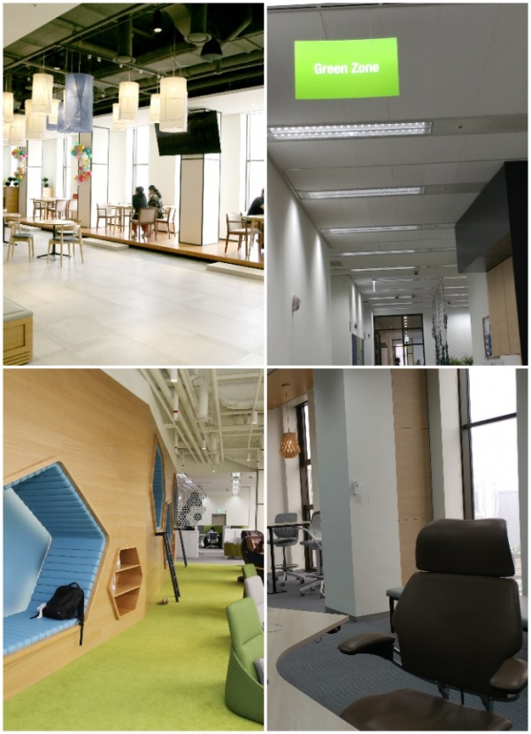 “이전엔 팀별로 분리된 지정좌석제 일 할때는 업무를 보다가도 팀원 간 잡담을 할 수 있는 분위기 였죠. 블루존 등 업무공간에선 잡담을 할 수 없죠. 회의 등 대화가 필요하면 캔틴에서 말해야 해요. 업무 집중도는 확실히 높아졌어요”