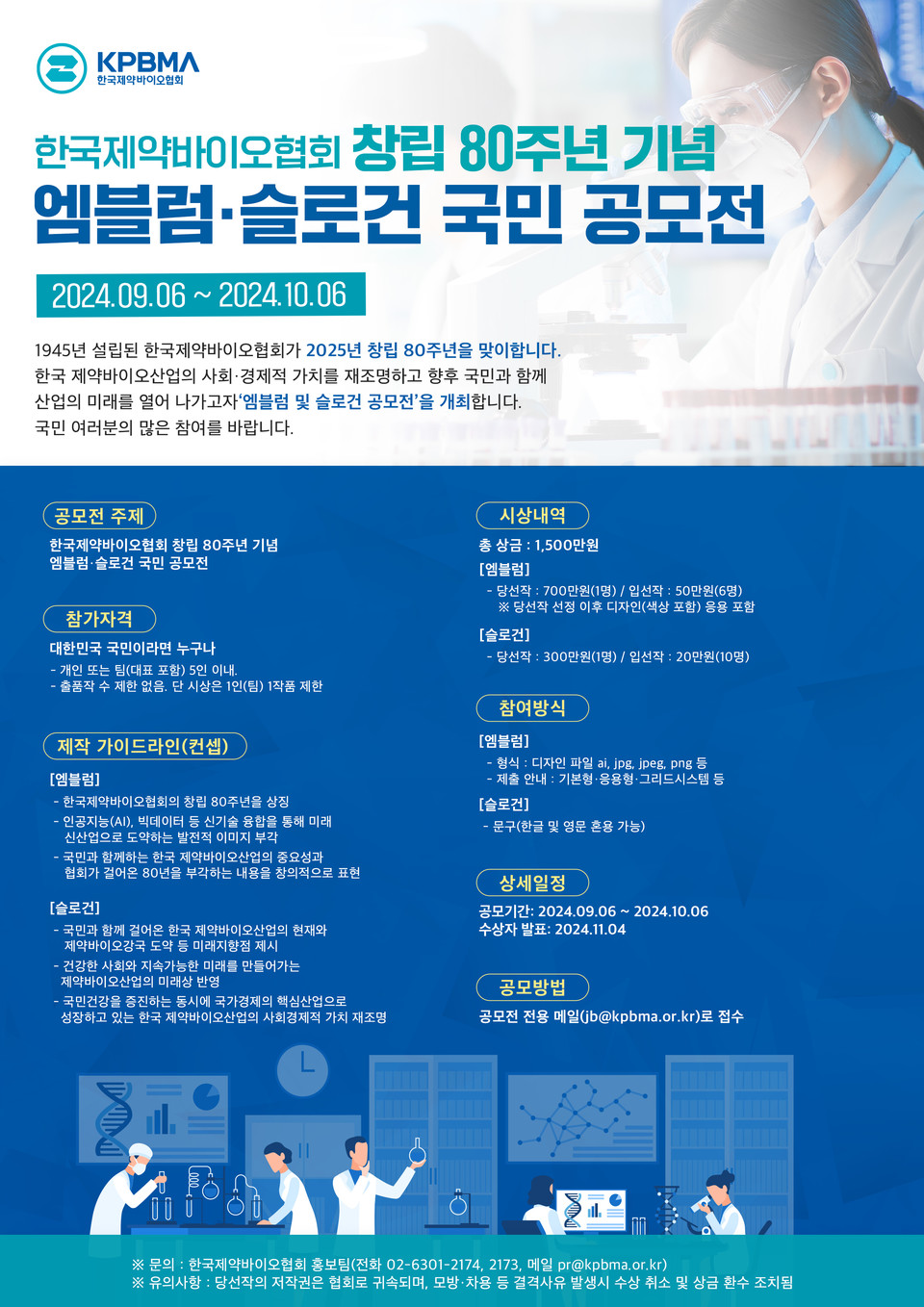 한국제약바이오협회(회장 노연홍)는 오는 10월 6일까지 '협회 창립 80주년 엠블럼·슬로건 국민 공모전’을 개최한다고 6일 밝혔다.