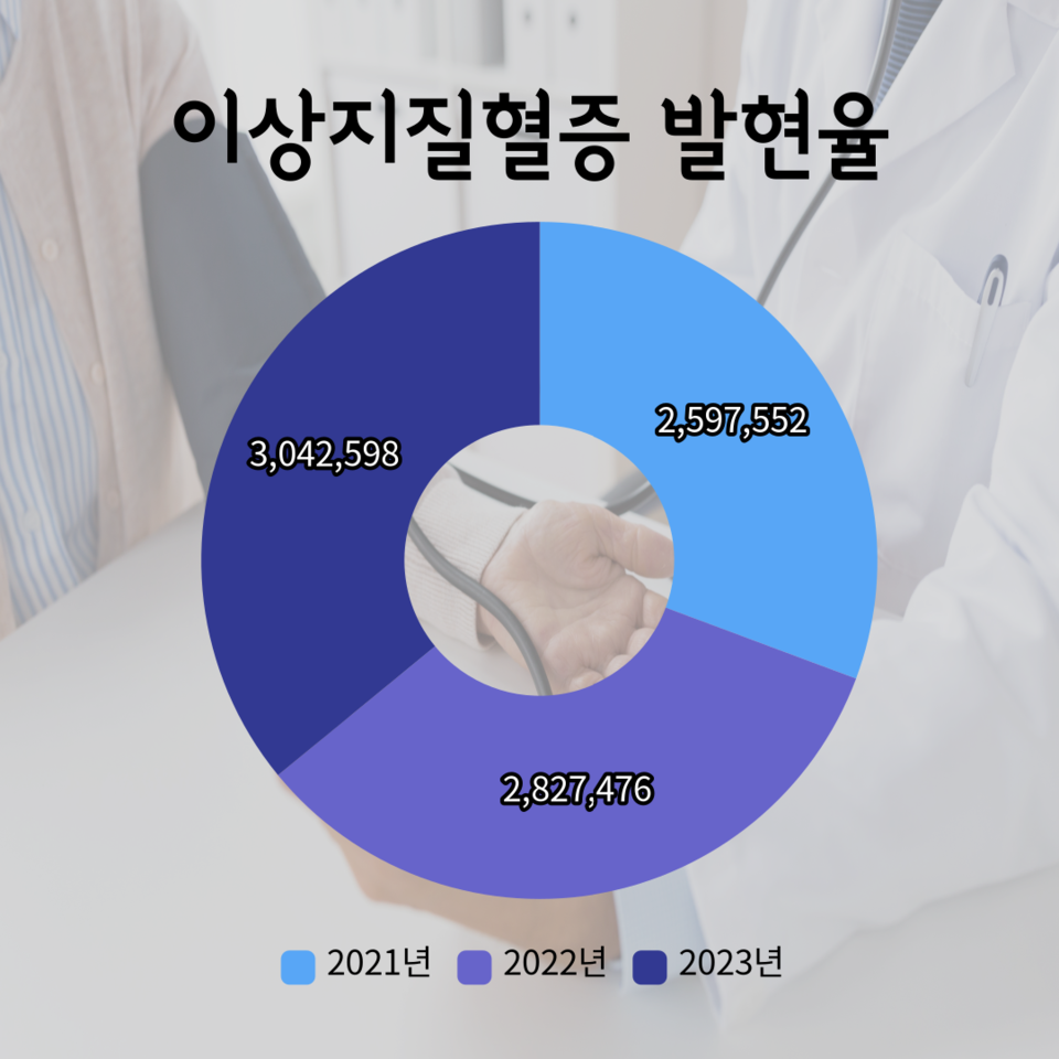 3일 관련 업계에 따르면, 이상지질혈증은 고혈압·당뇨와 마찬가지로 심혈관질환의 주요 원인 중 하나로 꼽힌다. 2021년 환자 수 약 260만명에서 2022년 283만명을 거쳐 2023년 304만명으로, 질병 발생률이 꾸준히 증가하고 있다.