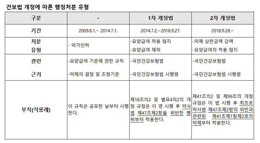 국민건강보험법 개정 시행일인 2014년 7월을 기준으로, 이전 행위는 약가인하, 이후 행위는 급여정지 처분이 내려진다.