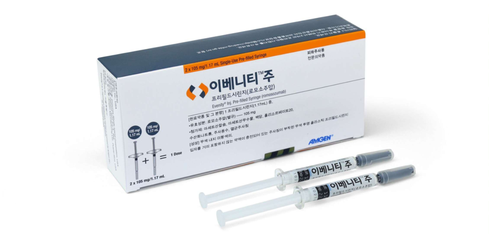 이베니티는 조골세포의 골형성 감소와 파골세포의 골흡수를 촉진시키는 스클레로스틴을 타깃하는 인간화 단일클론항체다. 이 작용기전으로 골흡수 억제와 골형성 촉진의 이중 효과를 동시에 작용하는데, 한 달에 한 번 피하 투여(총 12회까지 투여)로 환자의 T-score를 개선할 수 있다.