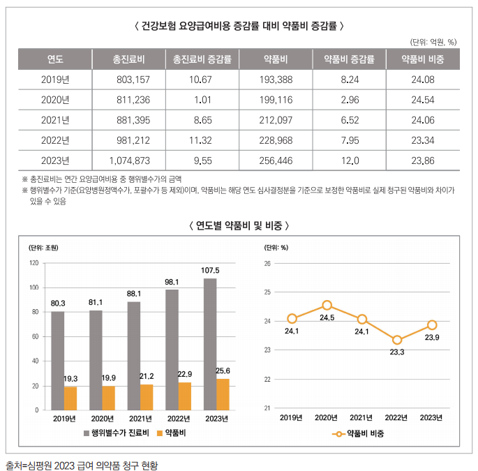 건강보험심사평가원이 발표한 <2023 급여 의약품 청구 현황>에 따르면 2023년 건강보험 총 진료비 대비 약품비 비중은 23.86%를 차지했다. 전년도인 2022년 23.34% 대비 0.52%p 증가했다. 또한 2019년부터 작년까지 청구 약품비 금액은 커지고 있지만 비율로 따지면 23~24%대를 유지하고 있다. 2019년 약품비는 19조 3388억원(24.08%)이었고 2020년 19조9116억원(24.54%), 2021년 21조2097억원(24.06%), 2022년 22조8968억원(23.34%)으로 집계됐다. 이들 약품비 중 신약이 차지하는 비율은 15%대다.