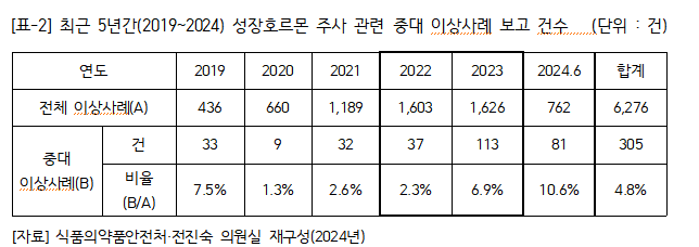 처방 증가세와 더불어 최근 5년간 성장호르몬 주사 치료제 관련 이상사례 보고건수도 늘었다. 2019년 436건에서 2023년 1626건으로 3배 이상 급증했다. 연도별로 살펴보면 2019년 436건, 2020년 660건, 2021년 1189건, 2022년 1603건, 2023년 1626건이었다.